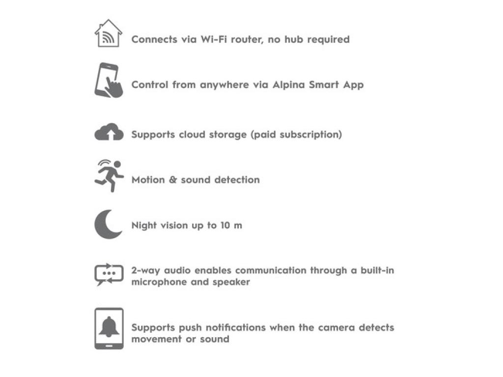 Όταν βρίσκεστε σε διακοπές, στη δουλειά ή αλλού εκτός σπιτιού, θέλετε φυσικά να παρακολουθείτε το σπίτι σας. Αυτό μπορείτε να το κάνετε εύκολα με την εφαρμογή alpina Smart Home, την οποία μπορείτε να κατεβάσετε μέσω του Google Play (Android) ή του App Store (iOS). Όταν η εφαρμογή είναι εγκατεστημένη στο smartphone σας, μπορείτε να λαμβάνετε ζωντανές εικόνες από το σπίτι, να περιστρέφετε και να κλίνετε την κάμερα και να διεξάγετε συνομιλίες διπλής κατεύθυνσης. Επίσης, λαμβάνετε push ειδοποιήσεις όταν η κάμερα ανιχνεύσει ήχο ή κίνηση.